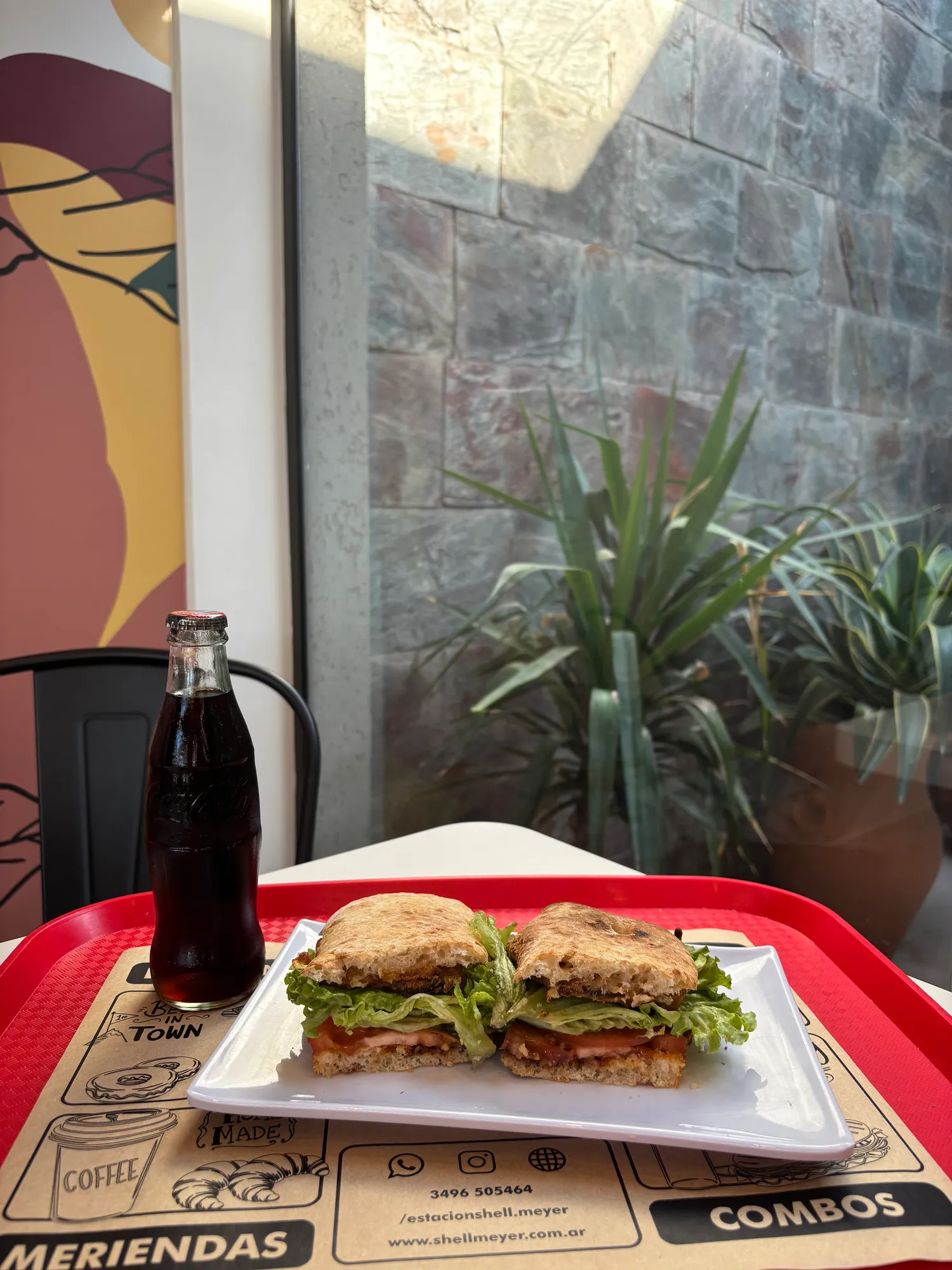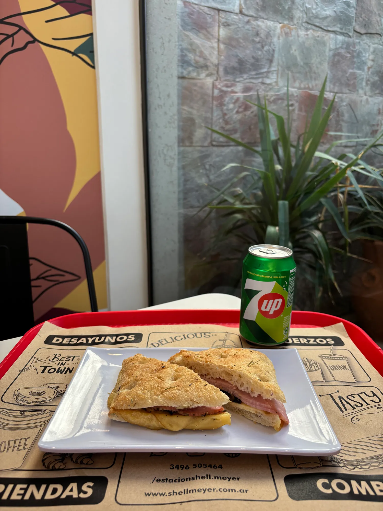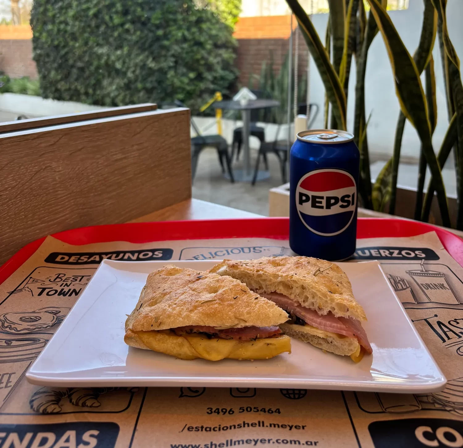 Panino saborizado (pan), queso crema, jamón cocido o jamón crudo, queso, lechuga y tomate.