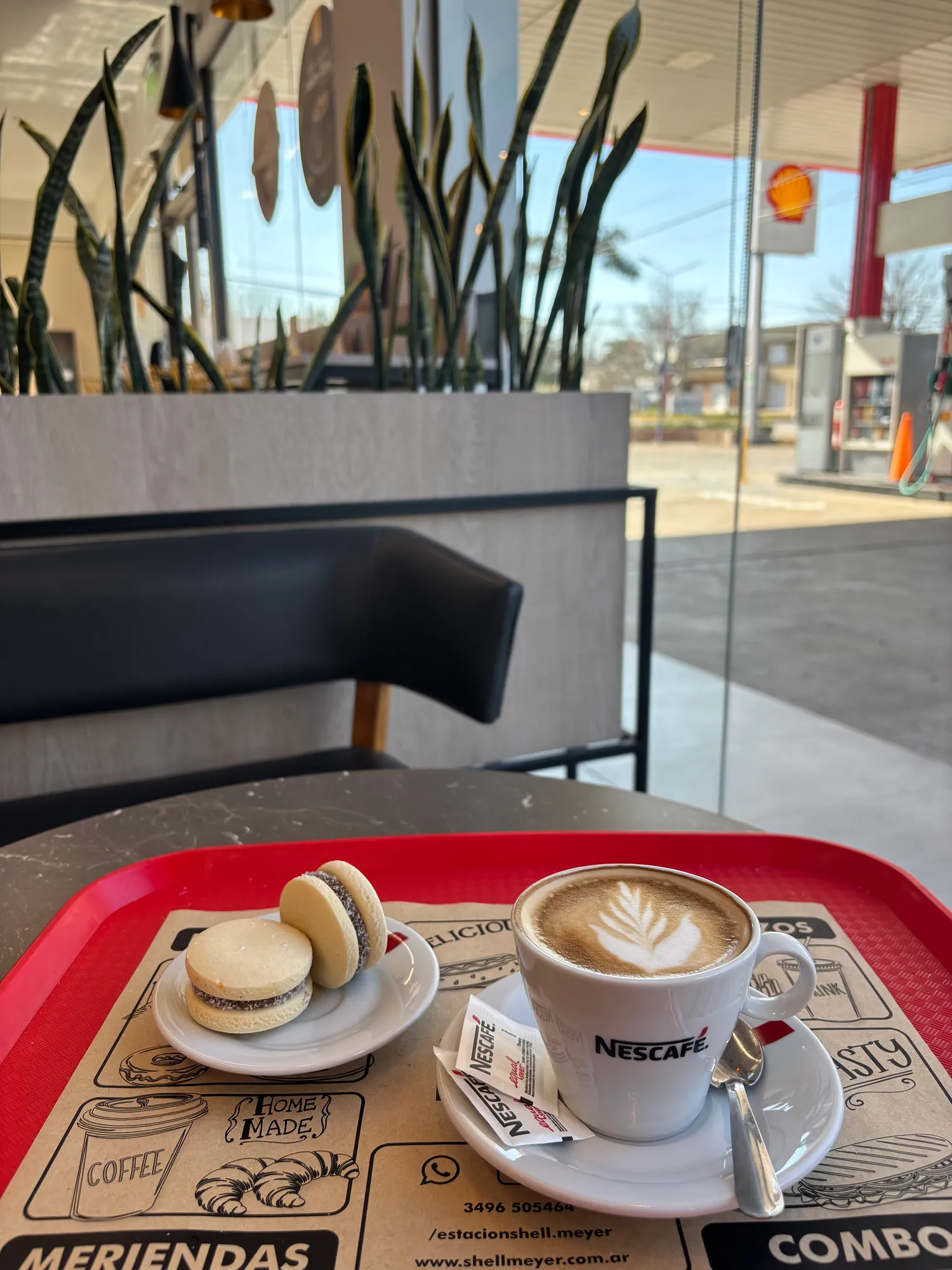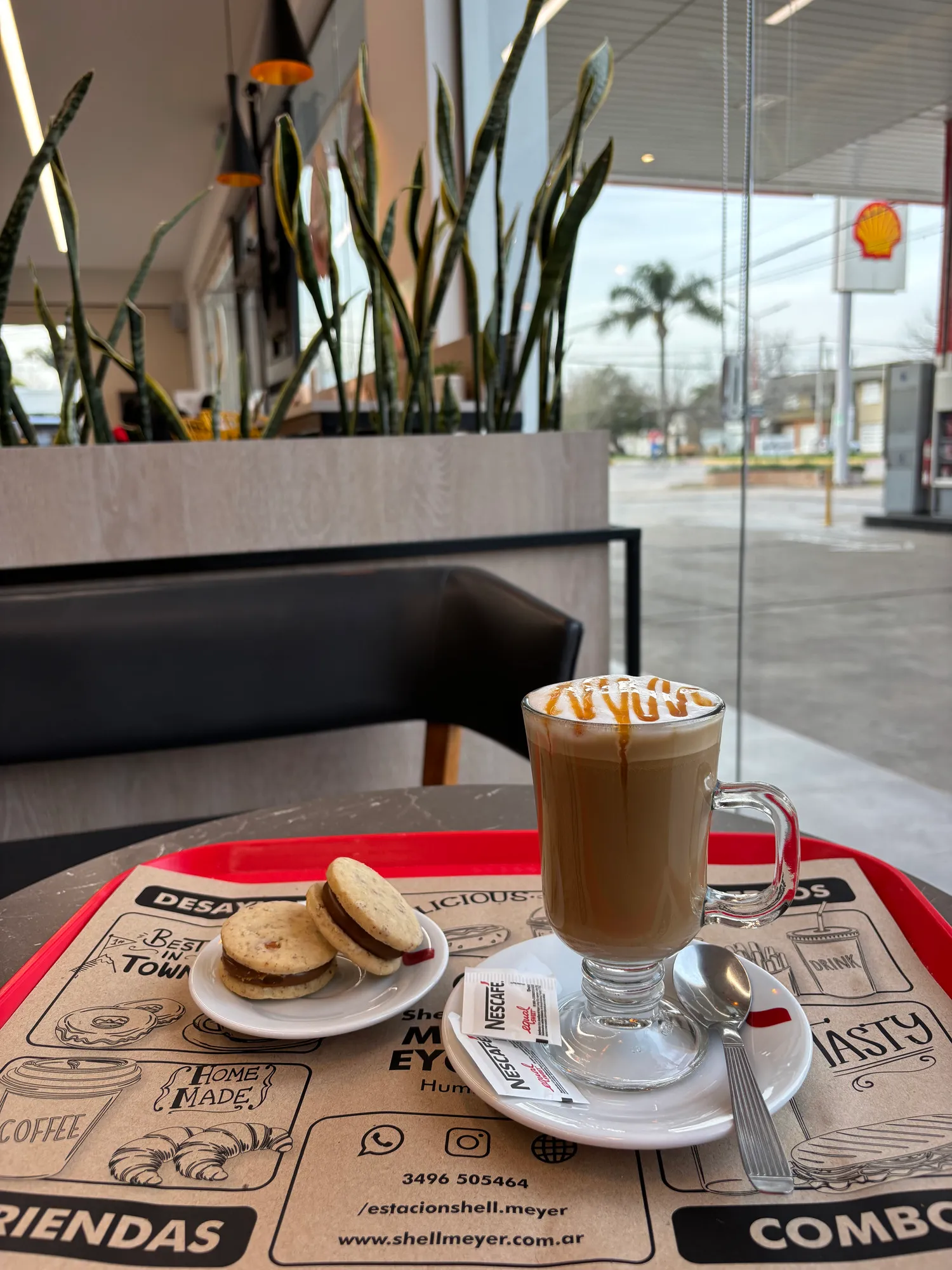 Hielo triturado, shot de café, leche, dulce de leche y decorado con chantilly y salsa de dulce de leche o chocolate